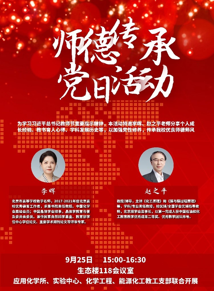 在全党上下深入开展学习贯彻习近平新时代中国特色社会主义思想主题教育开展之际,为学习习近平总书记教师节重要指示精神,大力弘扬教育家精神,2023年9月25日下午,必威西汉姆联应用化学、化学工程、实验中心、能源化工教工党支部联合开展了“师德传承”党日活动,该活动在工业生态楼118会议室线下举行。本次活动特邀李晖、赵之平教授分享个人成长经验、教书育人心得、学科发展历史等,旨在加强党员教师的党性修养,传承我校优良师德师风,学院近20余名教师参加。