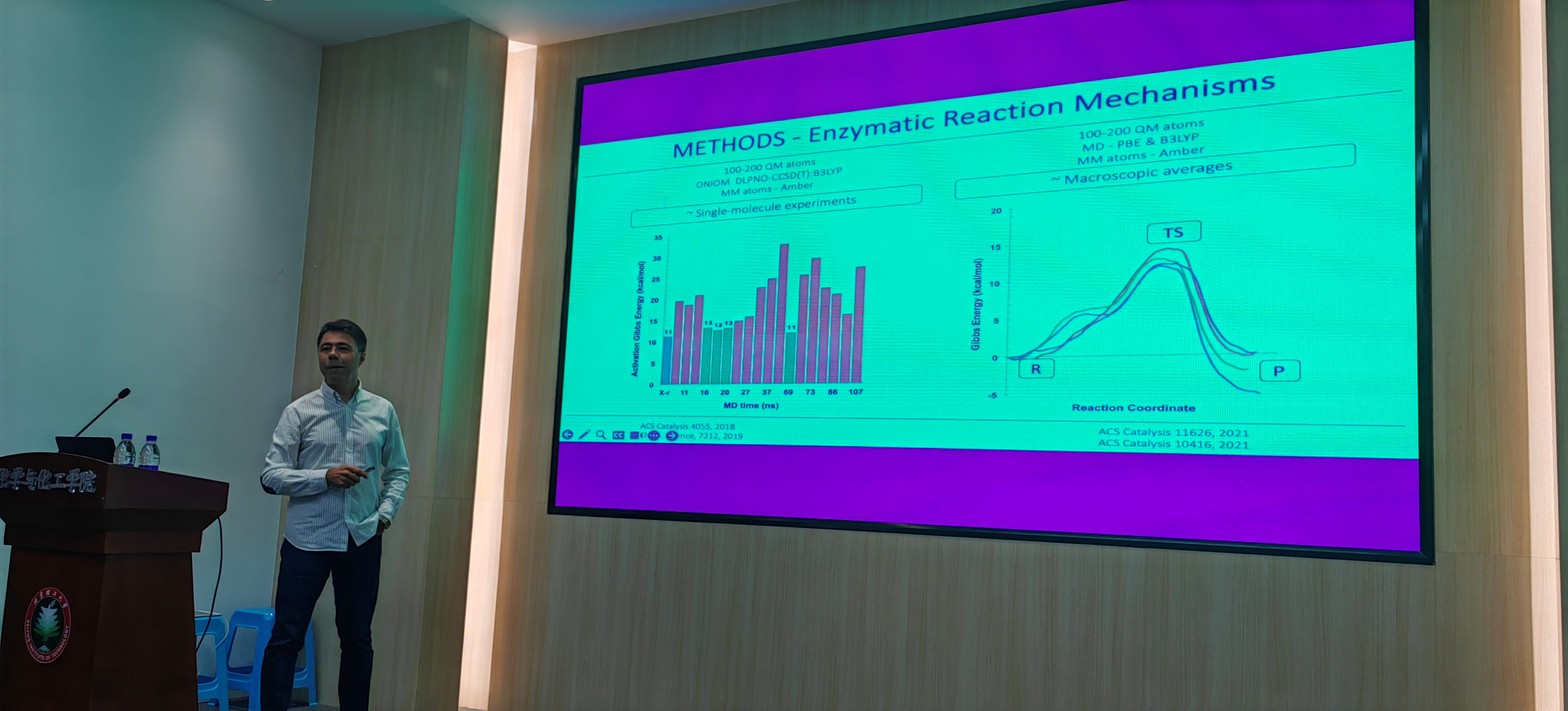 Pedro Manuel Azevedo Alexandrino Fernandes教授从酶催化与仿生催化剂的需求与设计谈起,深入浅出的介绍了目前通过量子力学/分子力学模拟酶催化过程与机制的理论与方法,随后讨论了他在蛇毒化学、脂肪酸合成、塑料生物降解等领域的研究工作。重点阐述了基于构效关系的理解,如何去预测提升酶催化速率的突变方法,从而设计更高效的酶。最后从整体上讨论计算机模拟带给人们的关于酶催化的新理解。