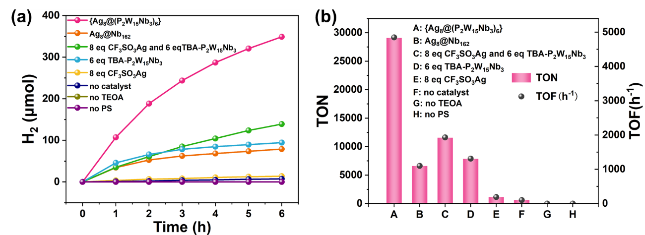 此外,得益于其独特的分子结构以及 Ag 活性位点与氧化还原活性的P2W15Nb3配体之间的协同作用,{Ag8@(P2W15Nb3)6}表现出极其出色的光催化析氢活性,光催化6小时后的产氢TON和TOF分别高达29,077和4846 h−1。