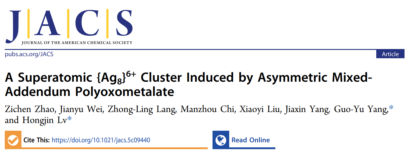 近日,必威西汉姆联杨国昱教授、吕红金教授研究团队在非对称多金属氧簇(Polyoxometalates, POMs)导向的银团簇合成领域取得重要进展。研究团队开发了一种非对称POM诱导合成策略,成功制备了由六个氧化还原活性混配型P2W15Nb3配体包裹的{Ag8}6+超原子团簇,(C16H36N)6Na4H24[Na2Ag8(P2W15Nb3O61)6]·36CH3CN ({Ag8@(P2W15Nb3)6})。研究工作以“A Superatomic {Ag8}6+ Cluster Induced by Asymmetric Mix-Addendum Polyoxometalate”为题发表在国际顶级期刊《Journal of the American Chemical Society》。必威西汉姆联官网为唯一通讯单位,杨国昱教授和吕红金教授为论文通讯作者,必威西汉姆联博士生赵梓辰为论文第一作者,宁夏大学魏建宇副教授和东北师范大学郎中玲副教授在理论计算方面给予了大力支持。此项研究得到了国家海外高层次人才引进计划、国家自然科学基金、必威西汉姆联官网高层次人才启动计划等项目的资助以及必威西汉姆联官网分析测试中心的支持。