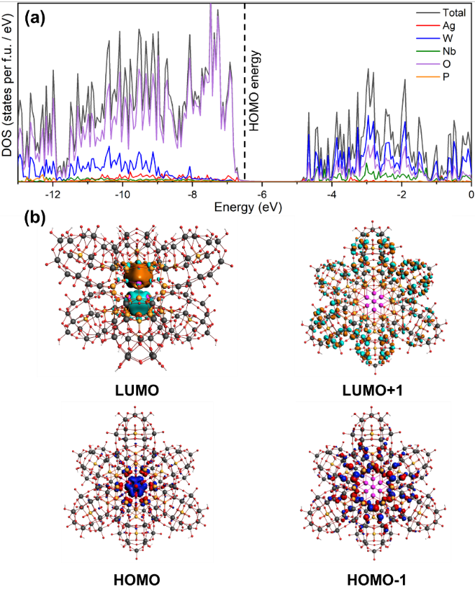 密度泛函理论计算表明,{Ag8@(P2W15Nb3)6}簇可被视为一个具有 2 个电子的闭壳层{Ag8}6+超原子簇,其jellium模型为1S2。HOMO-1由O(2p)轨道贡献,而LUMO+1位于P2W15Nb3配体壳内,具有较大的HOMO-LUMO带隙。