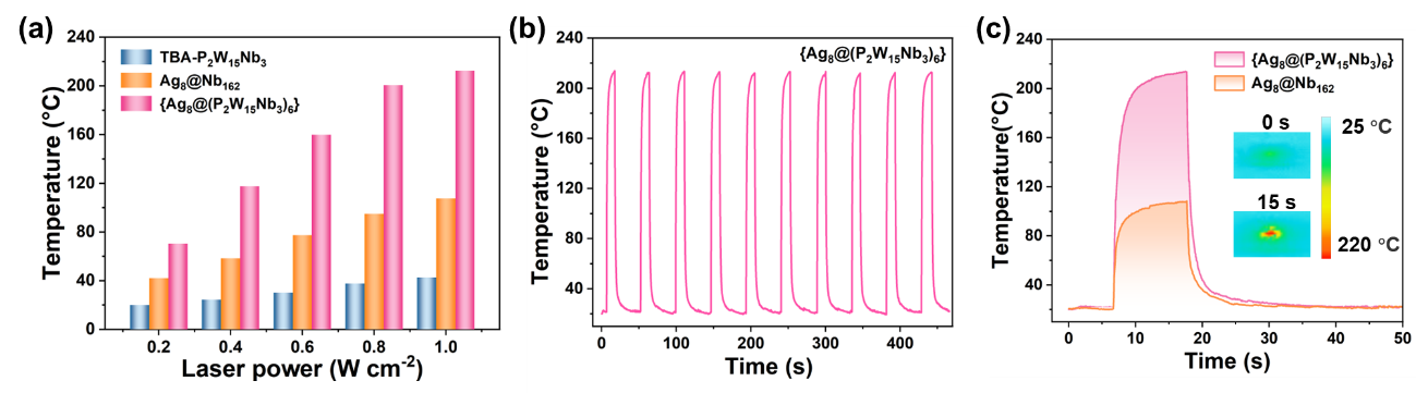 目标{Ag8@(P2W15Nb3)6}团簇在受到激光照射时,能够高效率地将吸收的光能转化为热能,表现出显著的光热转换性能。这主要是由于结构中存在具有氧化还原活性的P2W15Nb3配体,从而促进激发态团簇的非辐射弛豫过程。
