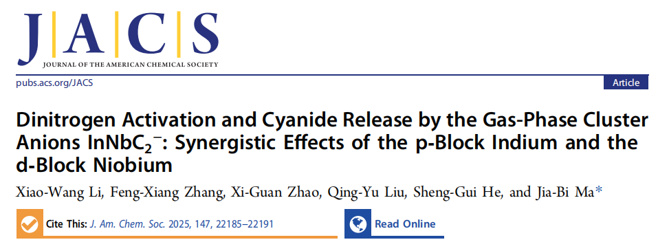 近日,必威西汉姆联官网马嘉璧课题组在气相团簇化学领域取得重要进展,相关研究成果以“Dinitrogen Activation and Cyanide Release by the Gas-Phase Cluster Anions InNbC2: Synergistic Effects of the p-Block Indium and the d-Block Niobium”为题在国际顶级期刊《J. Am. Chem. Soc》发表。