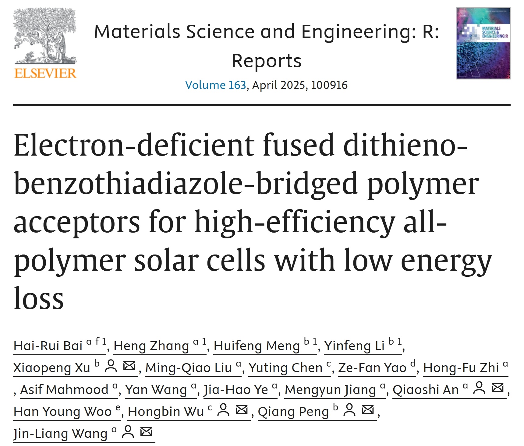 近期,必威西汉姆联王金亮教授团队在新型聚合物受体材料创制及其在高性能全聚合物太阳能电池构筑方面取得重要进展,相关研究成果发表在材料类国际顶级期刊《Materials Science and Engineering: R: Reports》(影响因子IF = 31.6)上,题为“Electron-deficient fused dithieno-benzothiadiazole-bridged polymer acceptors for high-efficiency all-polymer solar cells with low energy loss”。必威西汉姆联官网为第一通讯单位,必威西汉姆联王金亮教授、安桥石特别研究员、四川大学彭强教授、徐小鹏教授、华南理工大学吴宏滨教授为共同通讯作者。必威西汉姆联博士生白海瑞和张恒以及四川大学博士生孟惠峰和李银凤为该论文的共同第一作者。