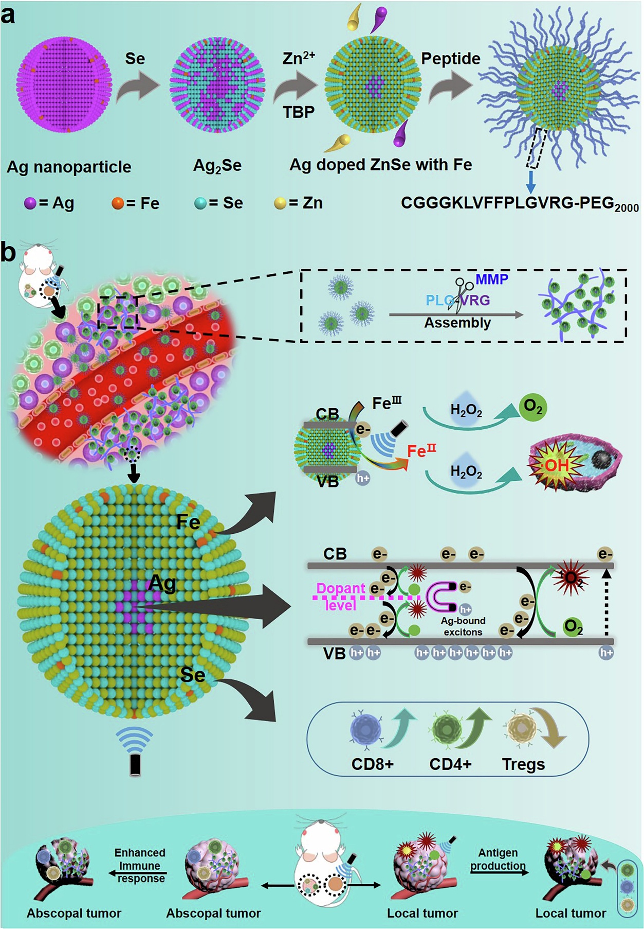 针对上述挑战,研究团队基于在纳米材料设计与肿瘤微环境调控领域的系列研究基础,提出构建银掺杂硒化锌(ZnSe)量子点,表面修饰原子级分散铁(Fe)并连接基质金属蛋白酶(MMP)响应肽(P1-PEG)的纳米平台(FAQD-1)。该设计通过三大核心机制实现高效癌症治疗:1、超声可控的化学动力学催化:FAQD 表面的原子级分散 FeIII在无超声时保持稳定。在超声作用下,FeIII接受电子还原为 FeII,触发芬顿反应分解肿瘤内高浓度 H₂O₂产生羟基自由基,实现精准 CDT。超声停止后,FeII可再转化为 FeIII,形成可逆价态循环,持续响应超声调控。2、增强的声动力学疗效:银(Ag)掺杂在 ZnSe 中形成中间能级,像 “磁体” 一样束缚激子、抑制非辐射复合,延长激子寿命,显著提升单线态氧(¹O₂)产生效率,增强 SDT 效果。同时,FeIII催化 H₂O₂分解产生氧气(O₂),缓解肿瘤缺氧,为O₂依赖的 SDT 提供充足 “燃料”。3、免疫协同抑制转移:ZnSe 中的硒(Se)作为免疫调节分子,在局部治疗后触发全身性抗肿瘤免疫反应有效抑制肿瘤转移,尤其对远端转移灶(如肺转移)有显著抑制作用。