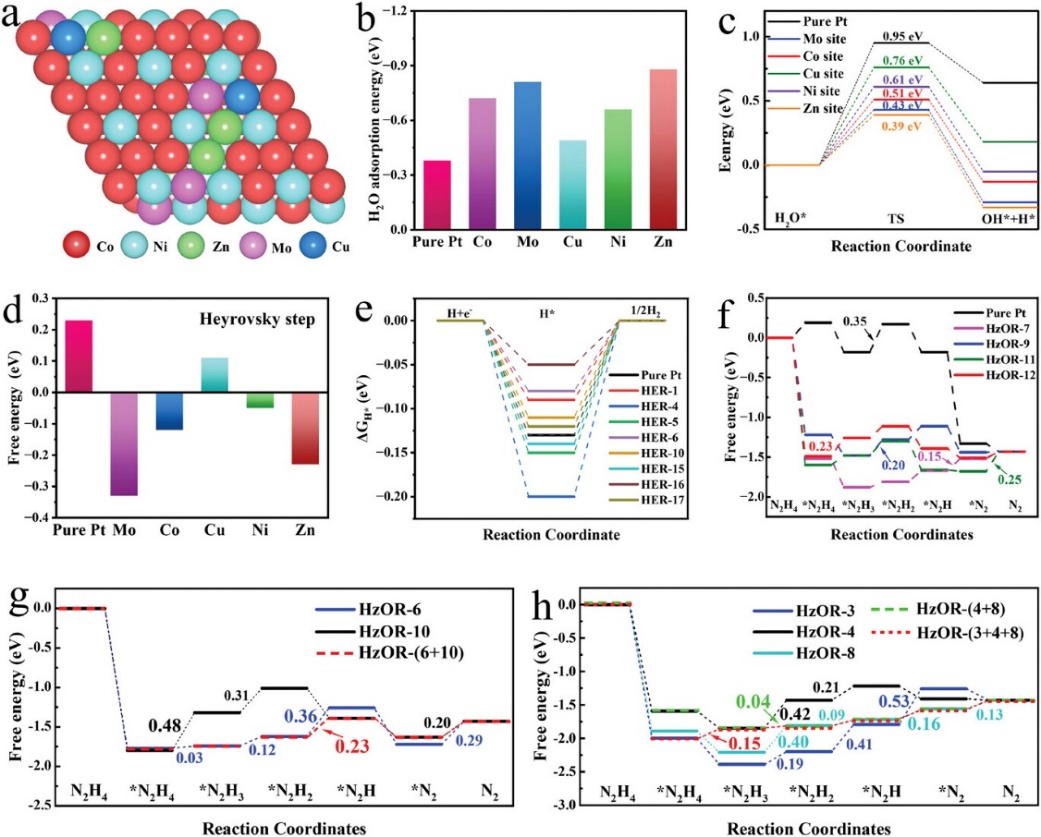 DFT计算表明,HEANFA在整个OHzS系统中的突出性能归功于其在HER和HzOR中丰富的高活性位点以及可优化的反应路径,尤其是在HzOR过程中实现了关键中间产物的智能化迁移,从而优化反应路径,将非活性位点转化为高活性位点。本工作不仅首次构建了HEANFA电极,实现了工业级电流密度下超低电压制氢,而且为高熵催化剂在能源相关领域中的其他独特催化特性的揭示提供了重要参考。