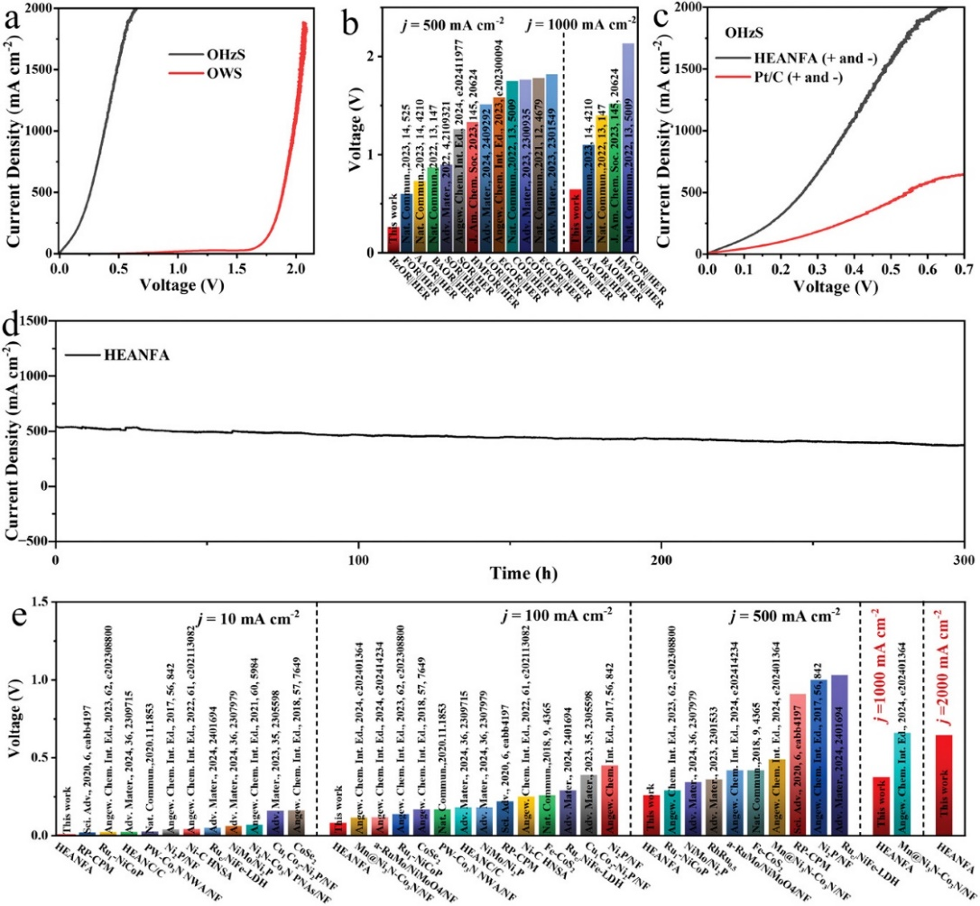 基于前期研究工作基础(Feng G, et al, Adv. Mater., 2024, 36, 2309715; Feng G, et al, Nat. Commun., 2019, 10, 4514; Feng G, et al, J. Am. Chem. Soc., 2021, 143, 17117; Feng G, et al, J. Am. Chem. Soc., 2023, 145, 11140; Feng G*, Huang ZQ*, et al, Energy Rev. 2025, 4, 100105),本工作创新性地构筑了NiCoMoZnCu高熵合金纳米花阵列(HEANFA)电极,其具有丰富的高活性位点和可优化的反应路径,在超低电压下实现了工业级电流密度产氢。在碱性HER和HzOR中均具有极为优异的催化活性。当采用HEANFA同时作为OHzS系统的阴极和阳极时,该系统表现出空前的产氢性能,分别仅需0.260、0.376和0.646 V的超低工作电压即可实现500、1000和2000 mA cm-2的工业级电流密度,相比于同等条件下电解水制氢系统节省电压1.5V以上,而且显著优于目前报道的其他OHzS系统以及其他小分子氧化辅助制氢体系。