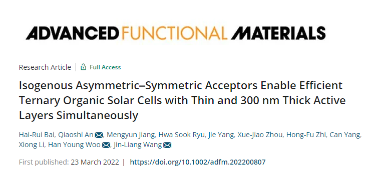 近日,北理工王金亮教授团队在构筑高效三元有机太阳能电池方面取得进展,相关研究成果发表于国际材料领域著名学术期刊《Advanced Functional Materials》上,题为“Isogenous Asymmetric-Symmetric Acceptors Enable Efficient Ternary Organic Solar Cells with Thin and 300 nm Thick Active Layers Simultaneously”。必威西汉姆联博士研究生白海瑞为论文第一作者,王金亮教授、安桥石特别研究员以及Han Young Woo教授(韩国高丽大学)为通讯作者,必威西汉姆联官网为第一通讯单位。论文的合作者还包括北京工商大学李熊教授。