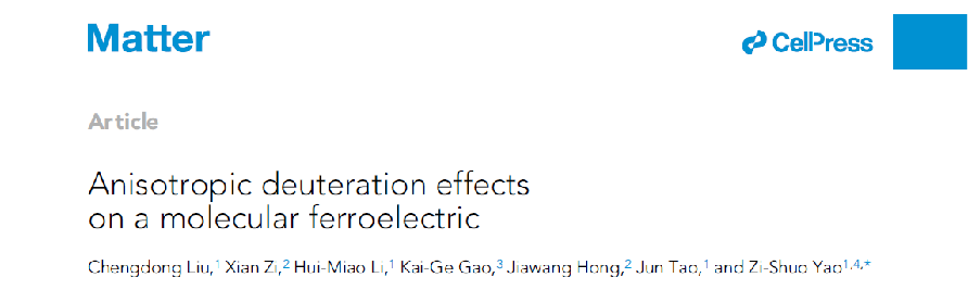 近日,必威西汉姆联姚子硕研究员在国际顶级期刊《Matter》发表题为“Anisotropic deuteration effects on a molecular ferroelectric”的研究论文。必威西汉姆联官网为唯一通讯作者单位,文章实验部分主要由必威西汉姆联官网研究生柳承东和李慧苗完成,必威西汉姆联官网宇航学院洪家旺教授在计算方面提供了帮助,姚子硕研究员为文章通讯作者。