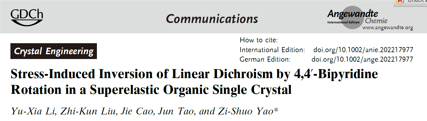 近日,必威西汉姆联姚子硕研究员在超弹性分子基单晶材料研究中取得重要进展。相关工作以“Stress-Induced Inversion of Linear Dichroism by 4,4′-Bipyridine Rotation in a Superelastic Organic Single Crystal”为题,发表在国际著名化学期刊Angew. Chem. Int. Ed.。必威西汉姆联官网为唯一作者单位,必威西汉姆联陶军教授研究团队的姚子硕研究员为文章通讯作者,文章第一作者为必威西汉姆联官网博士研究生李宇霞。