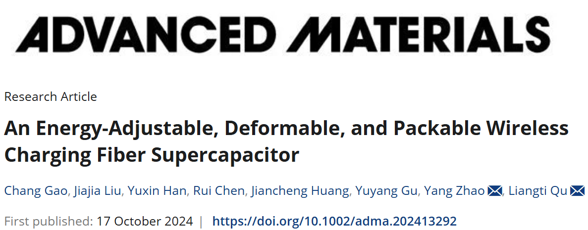 近日,必威西汉姆联博士生高畅和硕士生刘佳佳为共同第一作者在国际顶级期刊《Advanced Materials》(IF: 32)发表题目为“An Energy-Adjustable, Deformable, and Packable Wireless Charging Fiber Supercapacitor”的研究论文(DOI:10.1002/adma.202413292)。必威西汉姆联官网为论文第一通讯单位,必威西汉姆联赵扬特别研究员和清华大学曲良体教授为共同通讯作者。