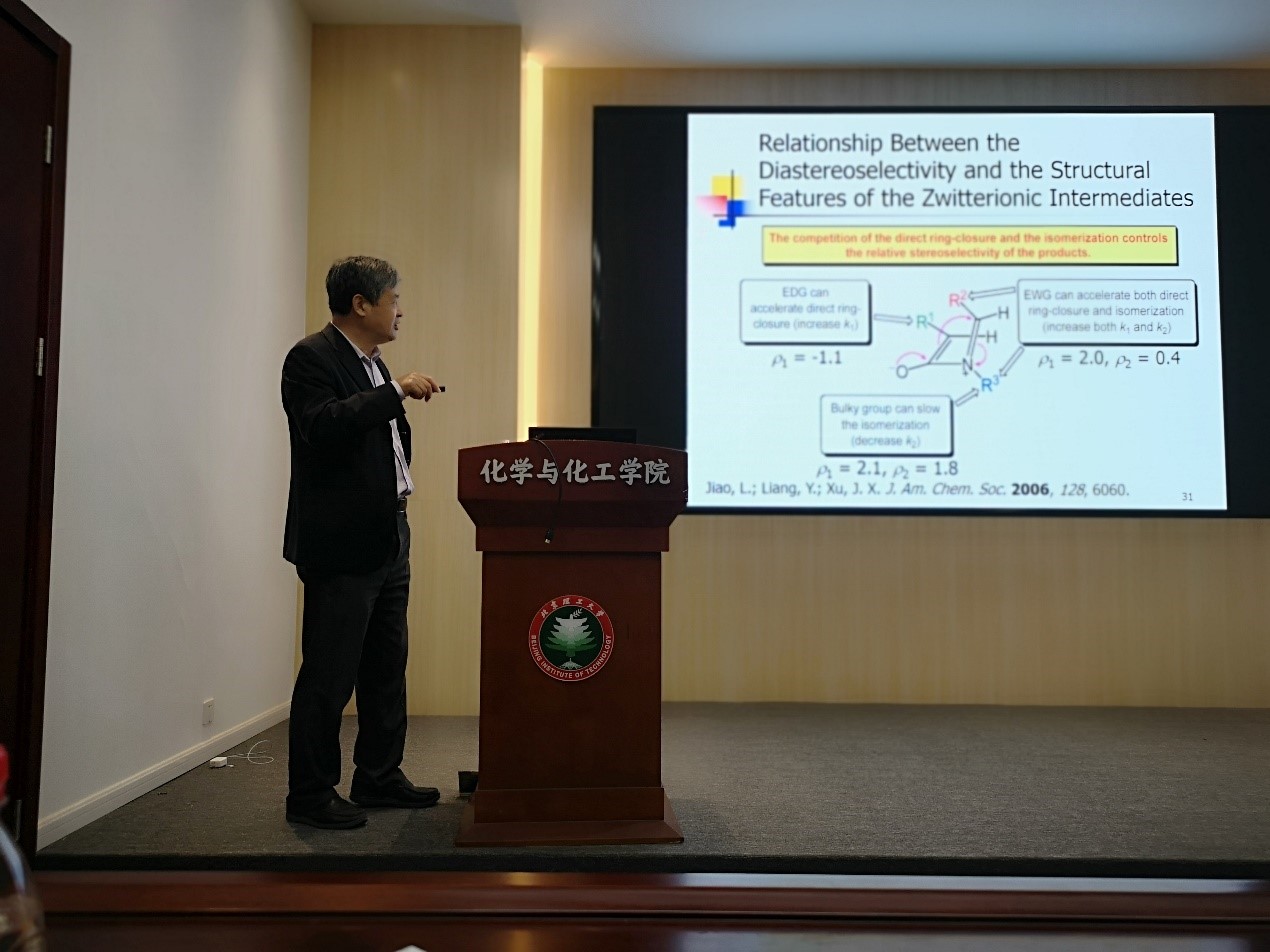 许家喜教授从β-内酰胺的实用价值出发,系统介绍了利用烯酮与亚胺的反应合成β-内酰胺的由来与发展,对该类反应的影响因素与反应机理通过量化的数据作了详细的讲解。此外,他还介绍了利用烯砜、膦烯酮与亚胺的反应来合成β-内酰胺类似物的最新进展,以及相关反应遇到的难题与解决思路,引发了现场师生的共鸣。交流环节,现场师生就报告内容和自身学习科研同许家喜教授进行了交流,许家喜教授一一回答了相关问题,同学们纷纷表示获益匪浅,现场氛围轻松又热烈。