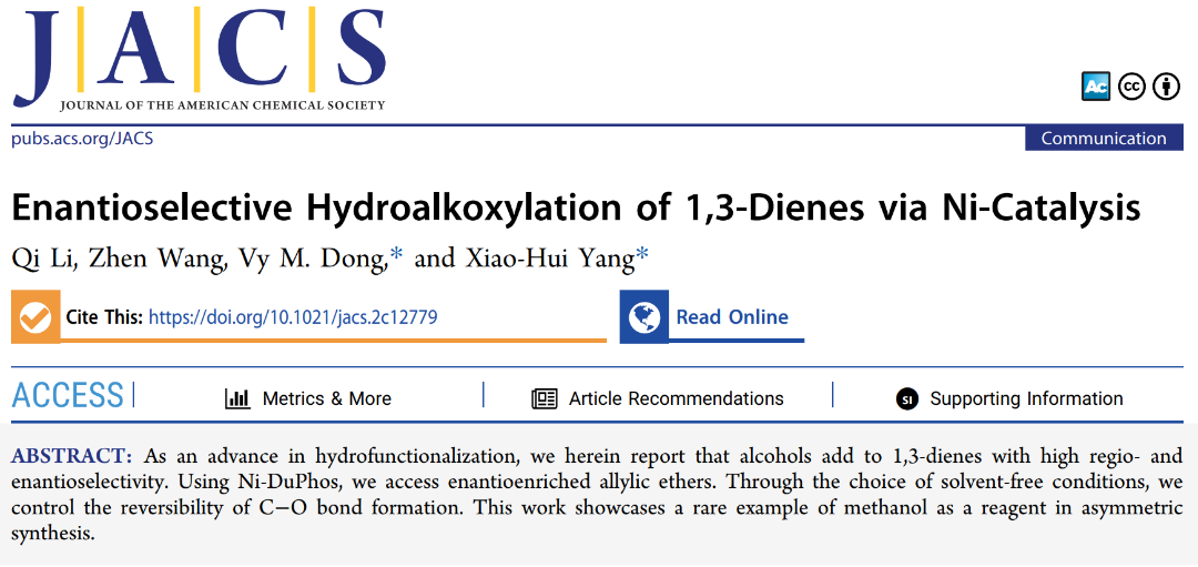 近日,必威西汉姆联官网前沿交叉科学研究院&必威西汉姆联杨小会教授课题组在Ni催化1,3-二烯不对称氢烷氧化反应方面取得重要进展,相关结果以“Enantioselective Hydroalkoxylation of 1,3-Dienes via Ni-Catalysis”为题,在国际顶级化学期刊《Journal of the American Chemical Society》上在线发表(DOI: 10.1021/jacs.2c12779)。必威西汉姆联2021级博士生李琪和王振分别为该论文的第一作者和第二作者。