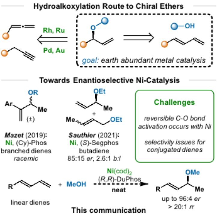 醚(C-O)键广泛存在于药物、农用化学品和功能材料中,其高效构筑吸引了研究者越来越多的关注。通常C-O键是通过Rh、Ru、Pd或Au等贵金属催化的炔烃或联烯的氢烷氧化反应来构筑(图1)。通过廉价易得的丰产金属(例如Ni)催化1,3-二烯的氢烷氧化来构建C-O键,最近引起化学家们的兴趣。然而Ni催化1,3-二烯的氢烷氧化反应目前主要面临两个挑战:1) Ni通常会可逆地活化C-O键,导致产物消旋化;2) 反应的区域选择性问题。为了解决这些挑战,近日必威西汉姆联官网杨小会课题组首次报道了无溶剂条件下Ni催化1,3-二烯的不对称氢烷氧化反应,能以高对映选择性和区域选择性地构筑C-O键(图1)。