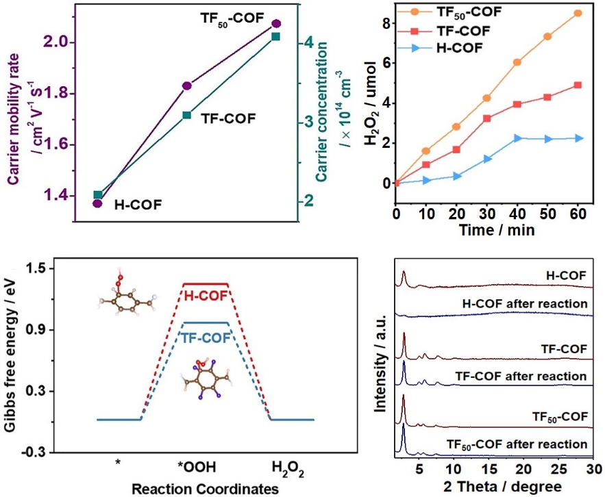 研究表明,部分氟化的COF(TF50-COF)具有AA堆积结构,其层间π-π相互作用力最强,结晶性最高,有效促进载流子迁移。其比表面积高达1903 m2 g–1,在1M HCl和1M NaOH等环境下都能保持结构完整。进一步研究发现,光催化产H2O2的活性与催化剂的结晶性正相关,TF50-COF表现出高的光催化活性(在模拟太阳光下的太阳能到化学能转换效率达0.17%),而无氟的亚胺键连接的三嗪基COF(H-COF)的层状结构发生破坏,光催化产H2O2的活性降低,充分展示部分氟化的COF的稳定性优势。