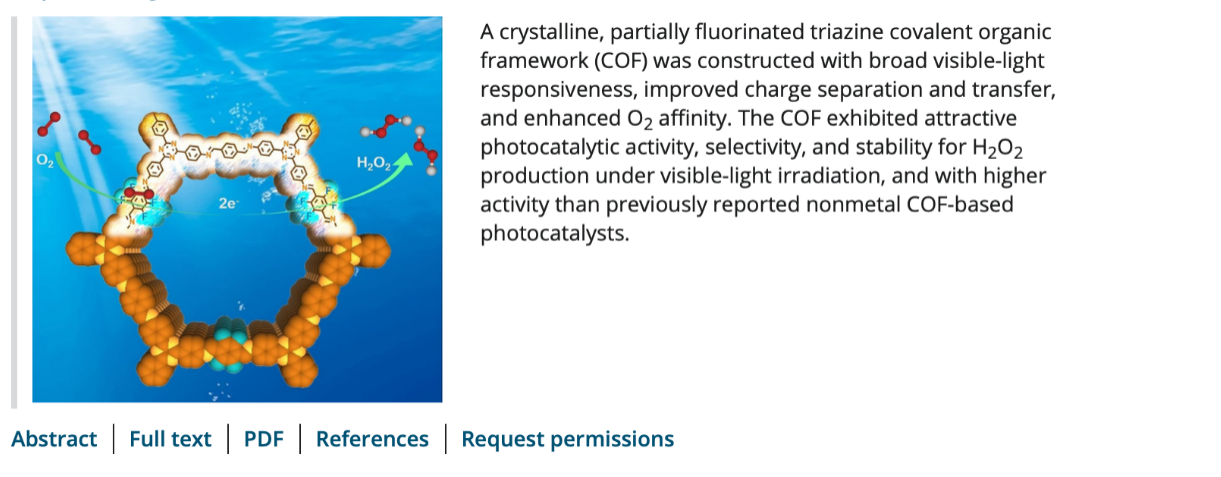 近日,必威西汉姆联官网的韩庆课题组提出了一种简单、高效的部分氟化的策略,构筑了高结晶性的亚胺键连接的三嗪基COF,显著增强其化学稳定性,实现高的电子传输效率,进一步研究了其在光催化氧气还原合成H2O2中的应用。文章的第一作者是必威西汉姆联官网的硕士研究生王浩桢。