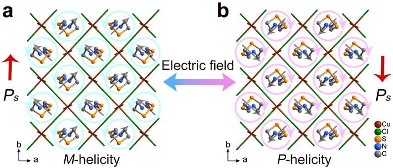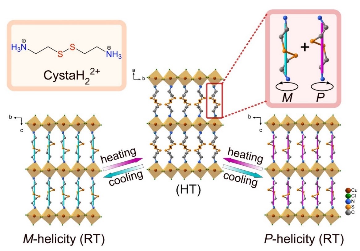 该研究团队在前期通过分子结构变化调控材料力、电、磁物理性质的基础上,(Nat. Commun. 2019, 10, 4805; CCS Chem. 2021, 2, 2464–2472; Nat. Commun. 2021, 12, 6908; Nat. Commun. 2021, 13, 3510),利用胱胺有机阳离子具有显著结构柔性且在结晶过程易于形成螺旋手性构型的特点,合成胱胺四氯合铜(II)二维钙钛矿型晶体。利用胱胺阳离子中间‒C‒S‒S‒C‒结构片段螺旋取向与分子电偶极矩的结构关联,通过电场控制该结构片段取向变化,首次实现了电场控制晶态分子的P-M螺旋手性以及铁电自发极化的协同反转。铁电性质与手性调控的耦合,不仅为外部刺激控制材料手性提供了研究思路,同时有望应用于开发新型手性电子器件。