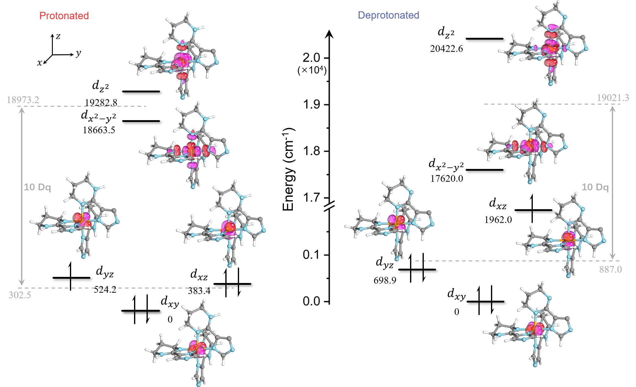 该研究利用有机配体内的双质子互斥效应合成了首例空气稳定且具有明显pH磁响应性质的Fe SCO-MOCs。该八核Fe在室温以上表现出SCO性质,而通过pH控制活性质子的数目,改变分子内空间位阻,可以实现高-低自旋态的可逆切换。在MOCs中加入碱去质子化过程中,嘧啶上NH质子被移除,分子由低自旋态变为高自旋态,而当再次引入酸后,分子重新恢复为低自旋态,从而实现了质子可逆诱导MOCs的自旋态转变。完全活性空间自洽场(CASSCF)第一性原理计算表明MOCs在去质子化前后配体场的微妙变化诱发了MOCs自旋态的转换。该方法为磁共振成像技术的优化与靶向药物递送系统的精准设计开辟了新的道路。