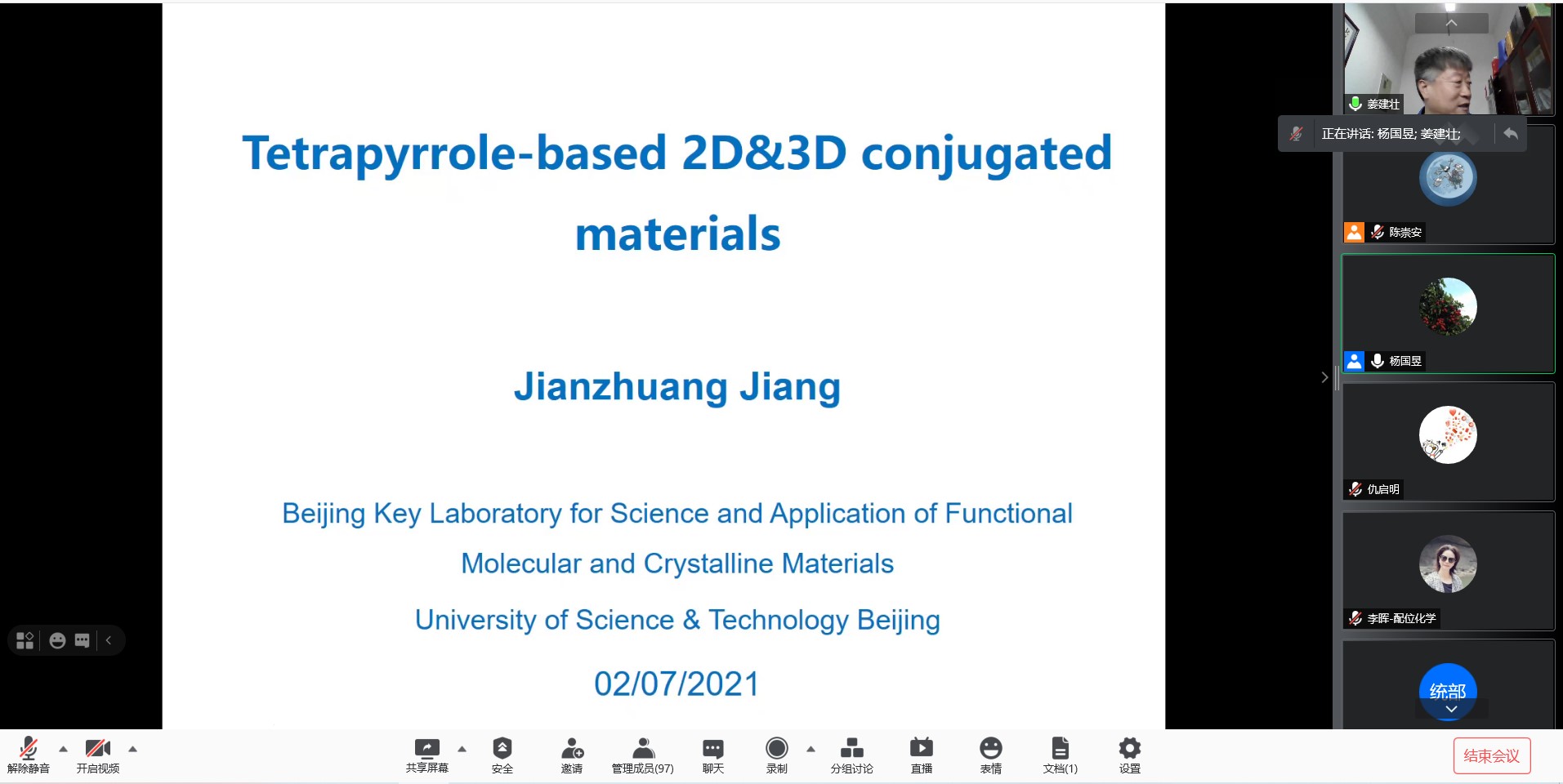 应必威西汉姆联邀请,北京科技大学姜建壮教授于2021年7月2日9:20做客北理工“百家大讲堂”,为我院广大师生带来题为“Tetrapyrrole-based 2D&3D conjugated materials”的精彩学术报告。本次报告在腾讯会议平台线上进行,由杨国昱老师主持,近百名化院师生参加了报告。