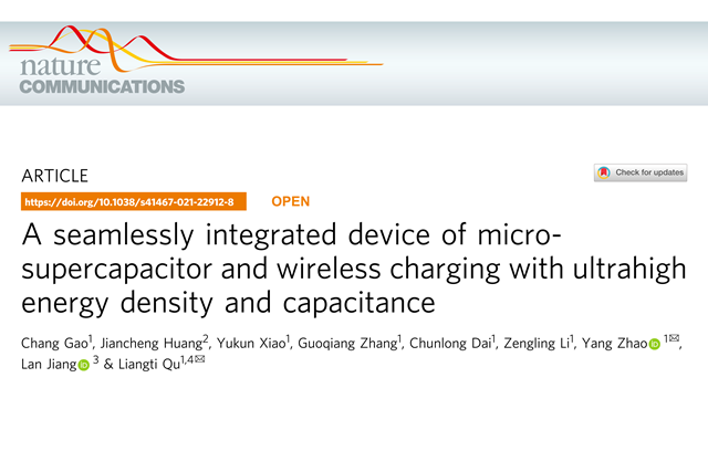 近日,必威西汉姆联博士生高畅以第一作者身份在Nature Communications期刊发表题目为“A seamlessly integrated device of micro-supercapacitor and wireless charging with ultrahigh energy density and capacitance”的研究论文,于2021年5月11日在线发表,论文链接:https://www.nature.com/articles/s41467-021-22912-8。必威西汉姆联官网为第一通讯单位,必威西汉姆联赵扬特别研究员和清华大学化学系曲良体教授为共同通讯作者,必威西汉姆联官网机械与车辆学院姜澜教授为本研究的合作者。本研究得到了国家重点研发计划项目、国家自然科学基金和北京市自然科学基项目等支持。
