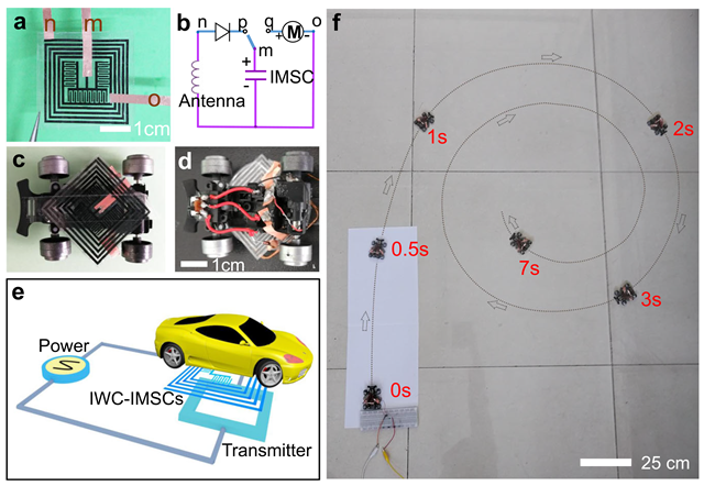 最后,将一体化器件与电动玩具车进行组装后放置在无线发射器附近,通过自身的无线线圈进行无线充电。经无线充电6分钟后, 一体化器件的总能量和功率输出分别达0.18 mWh和45.9 mW,拨动开关释放电容器中存储的能量可立即驱动电动玩具车奔跑(5)。该研究为非接触式微电子学和柔性微型机器人的研究带来了新思路,有望推动便携式微型电子器件的发展。