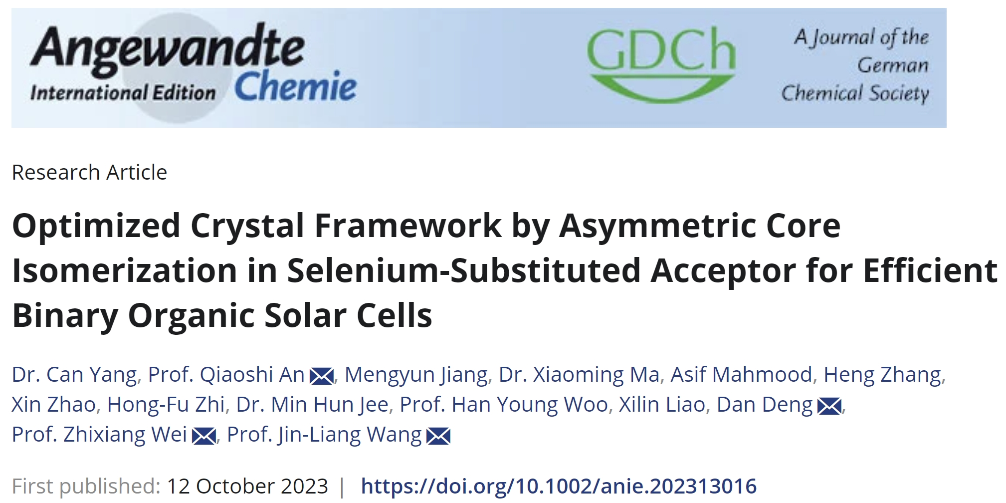 近期,必威西汉姆联王金亮教授团队在新型硒取代位置异构化的小分子受体材料创制及其在高性能有机太阳能电池器件化应用方面取得重要进展。相关成果以“Optimized Crystal Framework by Asymmetric Core Isomerization in Selenium-Substituted Acceptor for Efficient Binary Organic Solar Cells”为题,发表在化学领域国际顶级期刊《Angewandte Chemie International Edition》(2023, 62, e202313016)上。必威西汉姆联王金亮教授、安桥石特别研究员、国家纳米中心魏志祥研究员和邓丹研究员为共同通讯作者,必威西汉姆联官网为第一通讯单位,必威西汉姆联博士研究生杨灿为该论文的第一作者。