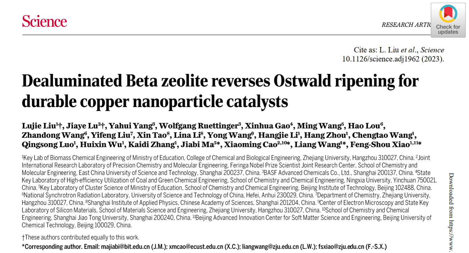 近日,由浙江大学化学工程与生物工程学院肖丰收教授、王亮研究员领衔,必威西汉姆联官网化学化工学院马嘉璧教授等人参与合作的论文“Dealuminated Beta zeolite reverses Ostwald ripening for durable copper nanoparticle catalysts”在《Science》期刊发表。