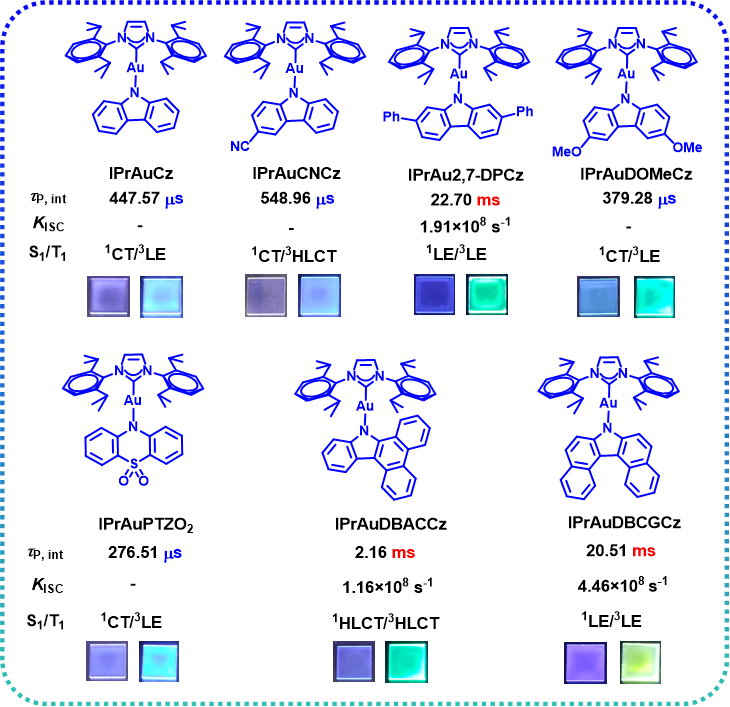 此外,一系列的CMA配合物被合成出来以验证上述规律的普适性。这一系列配合物均具有较长的三重态寿命,较大的ISC速率以及足以盖过其荧光的磷光强度。理论计算也表明其Au轨道对于T1的贡献较少,证明上述规律对于简单CMA配合物具有较好的普适性。