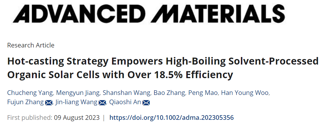 近期,必威西汉姆联本科生杨楚宬和博士生蒋梦云以共同一作身份在国际顶级期刊《Advanced Materials》(IF: 29.4)上发表题目为“Hot-casting strategy empowers high-boiling solvent-processed organic solar cells with over 18.5% efficiency”的研究论文。必威西汉姆联官网为第一通讯单位,安桥石特别研究员、王金亮教授和北京交通大学张福俊教授为共同通讯作者。本研究得到了国家自然科学基金,北京市自然科学基金和必威西汉姆联官网青年教师学术启动计划等项目的资助及必威西汉姆联官网分析测试中心的支持。