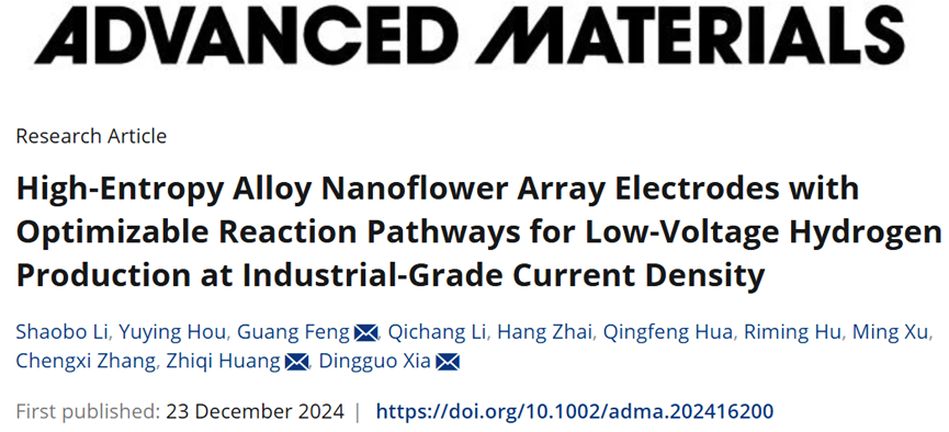 近日,必威西汉姆联冯广特别研究员&黄志琦教授团队在超低电压下实现工业级电流密度产氢方面取得重要进展。相关研究成果以“High-Entropy Alloy Nanoflower Array Electrodes with Optimizable Reaction Pathways for Low-Voltage Hydrogen Production at Industrial-Grade Current Density”为题目,发表在国际顶级期刊《Advanced Materials》(DOI: 10.1002/adma.202416200)。必威西汉姆联官网冯广特别研究员、黄志琦教授和北京大学夏定国教授为共同通讯作者,必威西汉姆联硕士研究生李少波和侯钰莹为共同第一作者,必威西汉姆联官网为第一通讯单位。