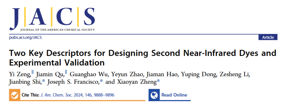近日,必威西汉姆联郑小燕副教授和材料学院石建兵副教授,与美国宾夕法尼亚大学Francisco教授合作,在近红外二区(NIR-II)荧光染料理论设计方面取得重要进展。相关成果以“Two key descriptors for designing second near-infrared dyes and experimental validation”为题发表于国际顶级期刊《Journal of the American Chemical Society》。必威西汉姆联官网为第一通讯单位,曾怡和屈佳敏两位博士生为共同第一作者,郑小燕、石建兵和Francisco教授为共同通讯作者,李泽生教授和董宇平教授对本工作给予了重要指导。