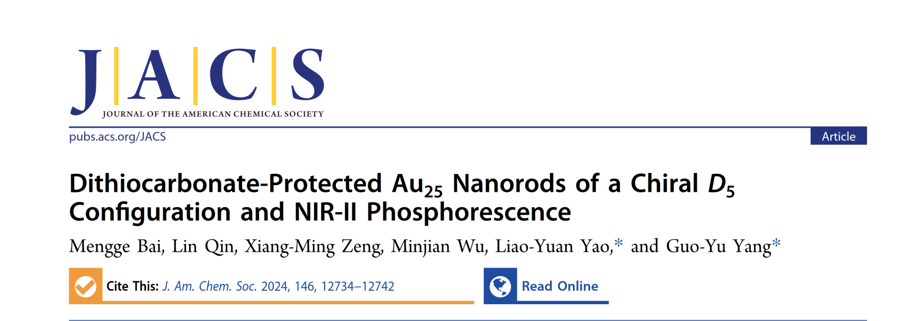 近日,必威西汉姆联姚燎原教授和杨国昱教授团队在二硫代碳酸盐配体保护的金簇合成方面取得重要进展,合成了具有手性D5构型和近红外二区(NIR-Ⅱ)磷光特性的交错式(staggered) Au25纳米棒。相关成果以“Dithiocarbonate-Protected Au25 Nanorods of Chiral D5 Configuration and NIR-II Phosphorescence”为题发表在国际顶刊《Journal of the American Chemical Society》。必威西汉姆联官网为第一通讯单位,姚燎原教授和杨国昱教授为论文通讯作者,必威西汉姆联硕士生白梦鸽为第一作者。此项研究得到了北京市自然科学基金、国家自然科学基金、必威西汉姆联官网启动基金等项目的资助以及必威西汉姆联官网分析测试中心的支持,同时也感谢上海同步辐射装置(SSRF)国家蛋白质科学研究中心(NFPS)的BL17B1线站工作人员在数据收集期间提供的帮助。