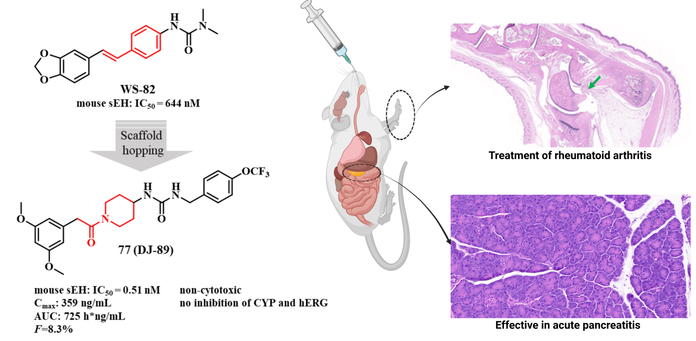 风湿性关节炎等慢性炎症性疾病因高致残率和现有药物副作用大、疗效不稳定等问题,而胰腺炎目前临床没有有效药物,长期面临治疗困境。sEH在炎症调控中至关重要,它代谢体内的有益的抗炎因子—环氧二十碳三烯酸,促使炎症发展,成为抗炎药物研发热门靶点。不过,此前进入临床II期试验的sEH抑制剂,因药代动力学缺陷或安全性问题折戟,目前没有任何药物被批准上市。这一现状使得开发具有全新化学骨架的药物变得尤为迫切,也极具重要意义。此前,我们设计了多种骨架的sEH抑制剂(European Journal of Medicinal Chemistry 2024, 266, 116113;European Journal of Medicinal Chemistry 2024, 280.;Journal of Medicinal Chemistry 2024, 67, 18412−18447;Journal of Medicinal Chemistry 2024, 67, 22168-22190.)。此次,我们基于“骨架跃迁”策略,从天然二苯乙烯衍生物出发,设计合成了九种新型骨架化合物,最终筛选出以“苯乙酰哌啶”为核心骨架的DJ-89。该药物在多项实验中表现出色:1)超强抑制活性:DJ-89对sEH的抑制活性(IC50 = 0.51 nM)比临床候选药EC5026(19 nM)和TPPU(44 nM)高数十倍。2)独特抗炎机制:通过提升EETs水平并降低其代谢产物DHETs,DJ-89显著抑制促炎因子(TNF-α、IL-1β)水平,同时增加抗炎因子IL-10水平,这一“双效调节”机制具有创新性。3)体内显著疗效:在类风湿性关节炎大鼠模型中,DJ-89(10 mg/kg口服)有效减轻关节肿胀和骨侵蚀;在急性胰腺炎模型中,其抑制胰腺组织的炎症细胞浸润效果突出,同时血浆IL-6水平下降50%。4)优异的安全性:对hERG和CYP酶影响微弱,大幅降低临床用药风险。5)药代动力学良好:口服生物利用度达8.3%,半衰期1.89小时,且主要富集于sEH表达量高的肝、肾部位,脑部暴露量低,预示其全身抗炎作用显著且中枢副作用风险小。