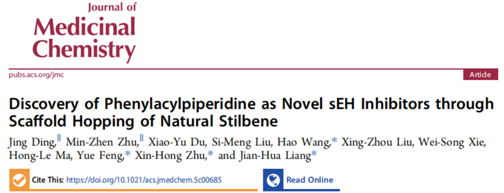 近日,必威西汉姆联医药分子科学与制剂工程工信部重点实验室梁建华课题组,以天然产物二苯乙烯为先导物,基于骨架跃迁策略成功优选出一种“新型可溶性环氧水解酶”(sEH)抑制剂DJ-89(化合物77),为临床需求未满足的胰腺炎和关节炎的治疗带来新策略,2025年4月14日以“Discovery of Phenylacylpiperidine as Novel sEH Inhibitors through Scaffold Hopping of Natural Stilbene”为题在线发表在国际权威的新药研发期刊《Journal of Medicinal Chemistry》(文章链接:https://doi.org/10.1021/acs.jmedchem.5c00685)。该候选药物的体外sEH酶抑制活性(IC50低至0.51 nM)远高于现有临床候选药物EC5026;并在急性和慢性炎症动物模型中抗炎镇痛药效显著。在风湿性关节炎模型中DJ-89通过抑制肝脏中sEH酶活性,提高抗炎因子EET水平,有效减轻组织和关节的炎症症状,显著改善了动物的健康状况。与现有关节炎临床药物治疗方法相比,DJ-89具有新的作用靶标和生物途径,具有优异的临床安全性,这一研究成果为风湿性关节炎等自身免疫性疾病的治疗提供了全新的解决方案。