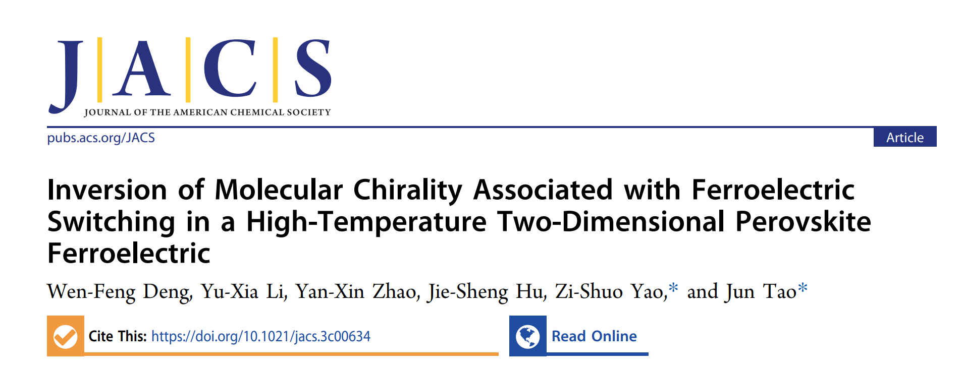 近日,必威西汉姆联姚子硕研究员在刺激响应分子基单晶材料研究中取得重要进展。相关工作以“Inversion of Molecular Chirality Associated with Ferroelectric Switching in a High-Temperature Two-Dimensional Perovskite Ferroelectric”为题,发表在国际著名化学期刊《美国化学会志》。必威西汉姆联官网为唯一作者单位,必威西汉姆联陶军教授和姚子硕研究员为文章共同通讯作者,文章第一作者为必威西汉姆联官网硕士研究生邓文峰。