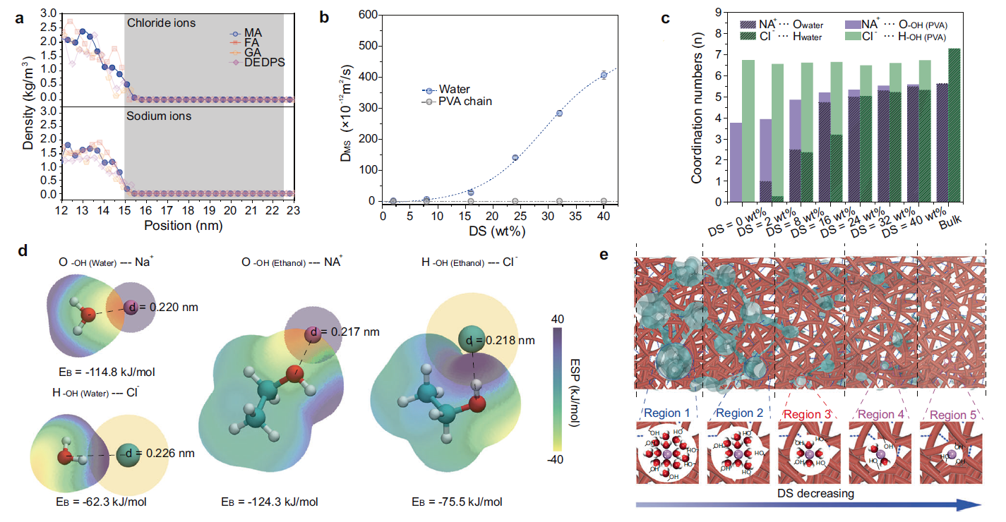 盐离子难以在PVA中溶解(图4a),并且膜溶胀度较高时,水分子在PVA膜内的扩散系数远高于盐离子扩散系数(图4b),该结果从溶解、扩散的角度解释了PVA膜高脱盐率的成因。此外,当膜孔小于或接近离子水合尺寸时,水合层减小以适应膜孔,PVA分子链通过补偿盐离子与水合层内水分子的相互作用,使盐离子在膜内的扩散系数减小。通过研究盐离子与水分子及PVA链上羟基的配位数解析了该跨膜补偿机制。如图4c所示,溶胀度较高(>24 wt%)时,膜的孔隙尺寸大于离子的水合尺寸,故盐离子与水分子的配位数受到溶胀度的影响较小。随着溶胀度降低,盐离子逐渐从水合层中裸露,并与PVA分子链发生相互作用。