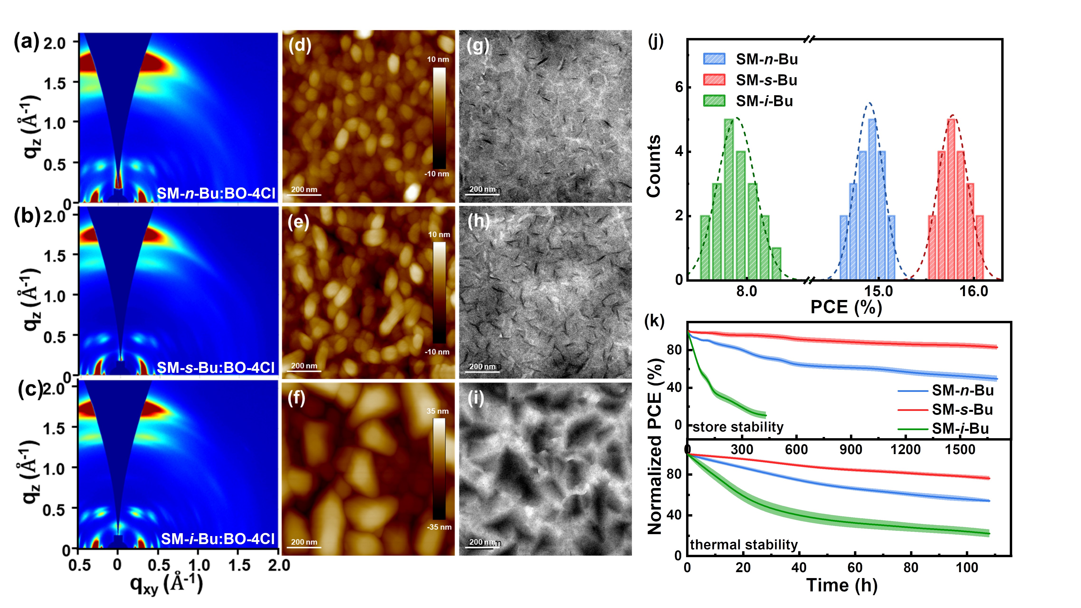 图2:基于三个异构化小分子给体的共混膜形貌(a-i)以及器件效率(j)以及稳定性(k)对比