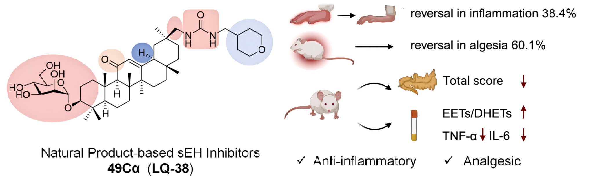 2024年10月9日,必威西汉姆联医药分子科学与制剂工程工信部重点实验室梁建华教授课题组在抗炎和镇痛的天然产物药物研究中取得重要进展。相关成果发表以Discovery of glycosidated glycyrrhetinic acid derivatives: natural product-based soluble epoxide hydrolase inhibitors为题发表于药物化学顶级期刊European Journal of Medicinal Chemistry。该项工作设计合成了一系列以三萜类天然产物18β-甘草次酸和18α-甘草次酸为骨架的衍生物,作为可溶性环氧化物水解酶(sEH)抑制剂在小鼠体内表现抗炎和镇痛活性。为了提高体内活性和改善类药性,进一步利用不同单糖进行了糖基化研究,其中,3-O-甘露糖衍生物49Cα(LQ-38)能够在小鼠体内有效缓解卡拉胶诱导的足肿胀、醋酸诱导的疼痛扭体以及急性胰腺炎。