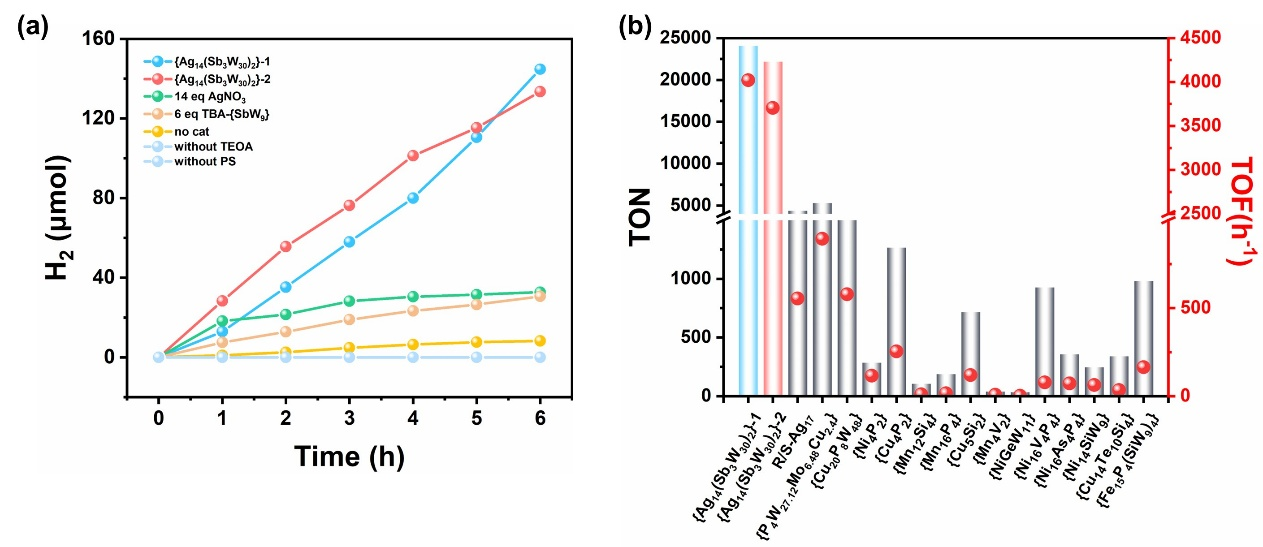 此外,作者发现得益于碗状{Sb3W30}配体和Ag活性位点的高效协同催化作用, {Ag14(Sb3W30)2}-1和{Ag14(Sb3W30)2}-2均表现出优异的光催化产氢性能,两例团簇光催化6小时的产氢TON分别高达24117和22233。