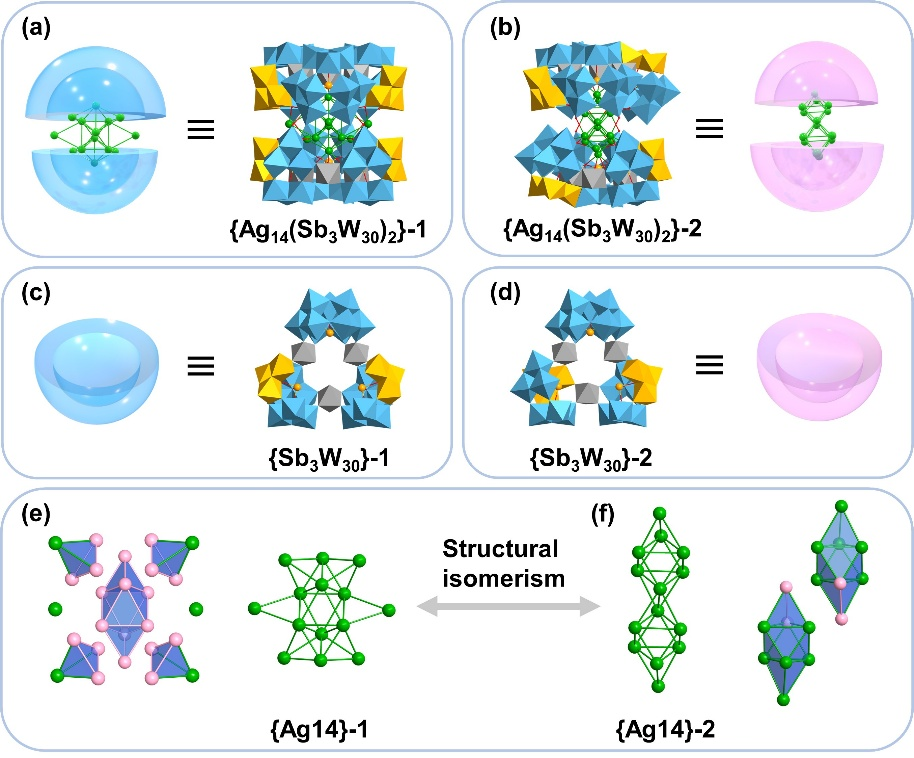 相比之下,具有丰富氧化还原特性的多金属氧簇(Polyoxometalates, POMs)稳定的Ag团簇通常表现出独特的物化特性和协同催化性能。而且,目前仅有一例POMs稳定的Ag团簇结构异构化案例被报道,如何快速推送该领域的蓬勃发展极具挑战性。基于此,必威西汉姆联官网研究人员发展了一种碗状POMs配体诱导合成策略,成功制备了具有结构异构化的{Ag14}10+团簇:{Ag14(Sb3W30)2}-1和 {Ag14(Sb3W30)2}-2;研究表明{Ag14}10+团簇的结构异构化主要受到碗状{Sb3W30}配体中配位氧原子的不同分布所诱导。