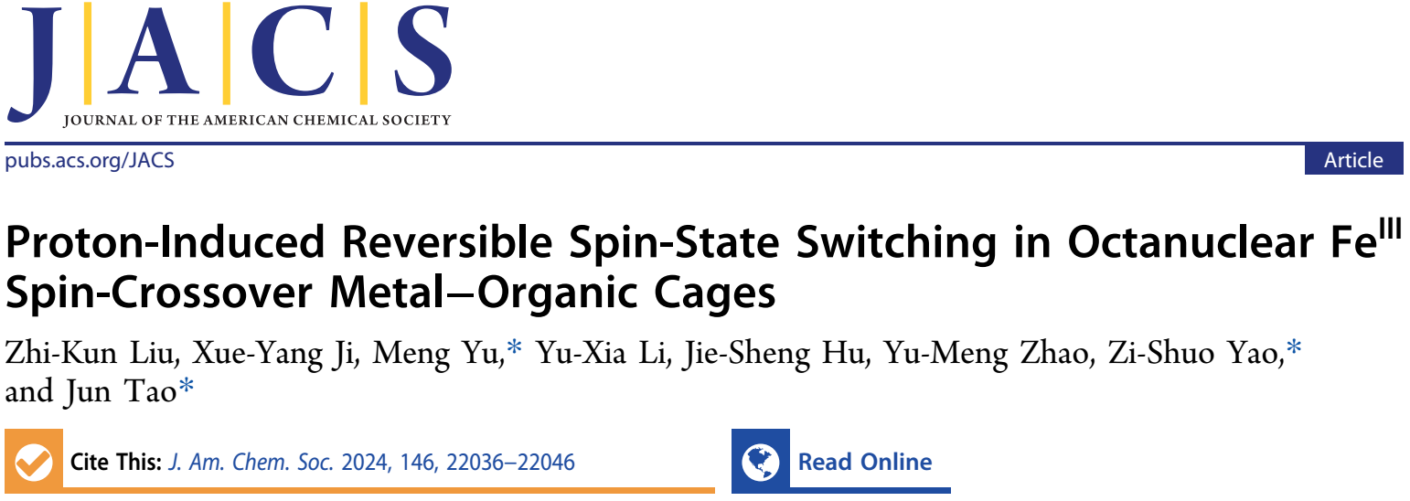 近日,必威西汉姆联陶军教授团队在自旋交叉金属有机笼方面取得重要进展。相关研究成果以“Proton-Induced Reversible Spin-State Switching in Octanuclear FeIII Spin-Crossover Metal–Organic Cages”为题目,在国际知名期刊《美国化学会志》(Journal of the American Chemical Society)上发表(DOI: 10.1021/jacs.4c07469)。必威西汉姆联博士研究生刘志坤为该文章的第一作者,必威西汉姆联陶军教授、姚子硕特别研究员和余蒙特别研究员为文章共同通讯作者。