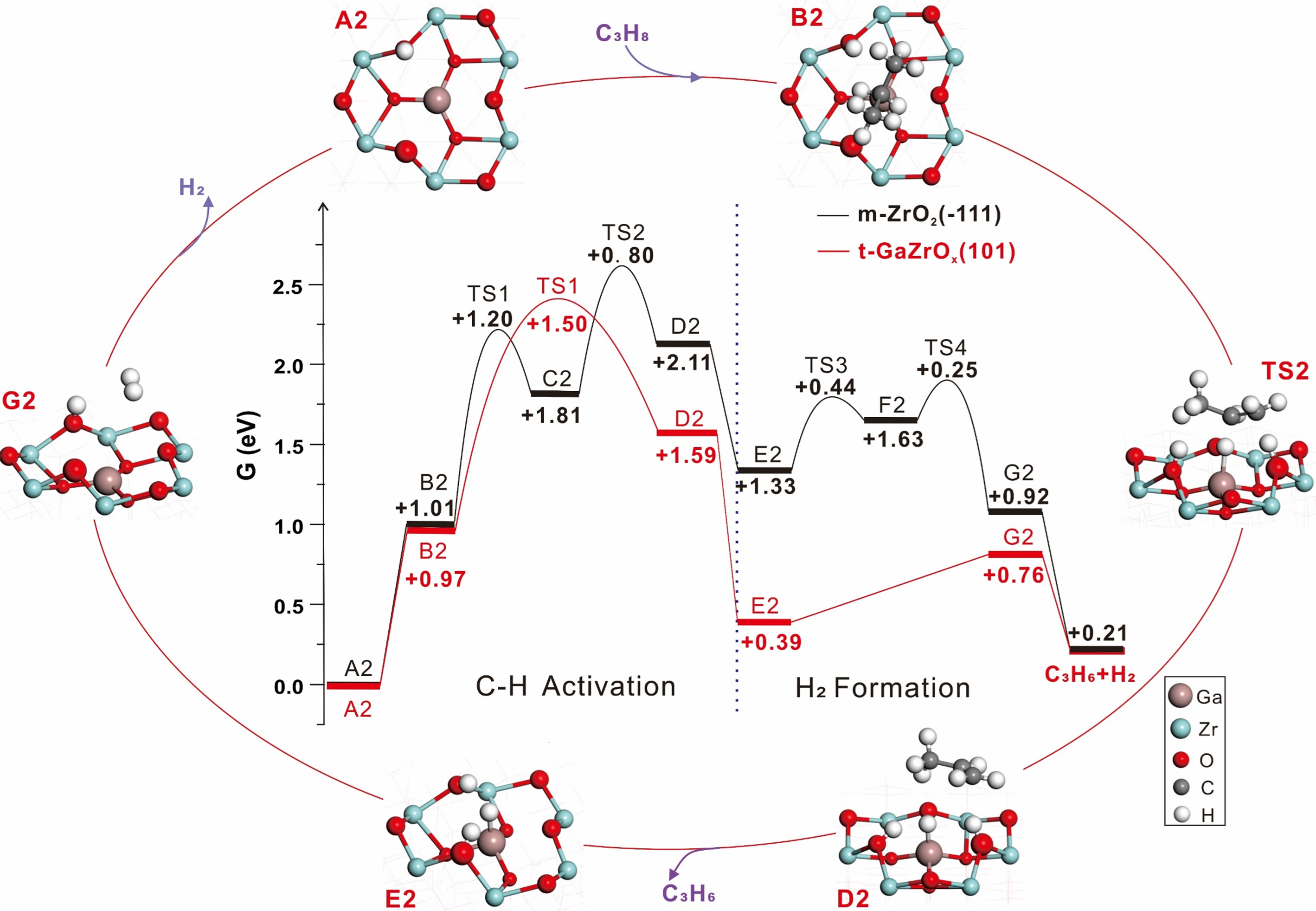 为了阐述GaZrOx催化剂在PDH中的反应中间体和催化机理,采用原位红外(in situ DRIFTS)和DFT计算对代表性的ZrO2和GaZrOx−0.2催化剂进行研究。In situ DRIFTS结果表明,GaZrOx−0.2在1988 cm-1出现归属于Ga-H物种的振动峰,说明Ga原子会参与到PDH反应过程,且该振动峰强度随反应时间的增加而增加,表明Ga−H物种持续生成并积累,而在ZrO2上没有观察到类似的信号。DFT计算结果表明,在ZrO2中掺杂Ga使得丙烷脱氢反应中C−H键的活化方式由逐步机制变为协同机制,降低了C-H键的活化能垒,Ga−O−Zr−O结构是GaZrOx催化剂PDH活性位点,具有更高的PDH本征活性,与实验结果相一致。此处所展现的通过金属掺杂调控金属氧化物催化剂C−H键活化能力的策略同样适用于其它催化体系中。