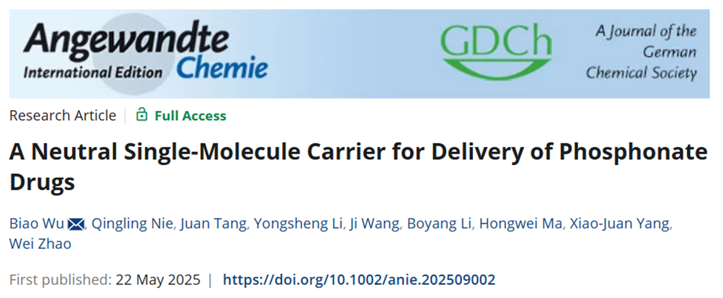 近日,必威西汉姆联吴彪教授、唐娟特别研究员和赵伟特别研究员在国际知名化学期刊《Angewandte Chemie International Edition》上发表题目为“A Neutral Single-Molecule Carrier for Delivery of Phosphonate Drugs”的研究论文。该论文的第一作者为必威西汉姆联官网博士研究生聂清玲。此项研究得到了国家自然科学基金,北京市自然科学基金和必威西汉姆联官网青年教师学术启动计划等项目的资助及必威西汉姆联官网分析测试中心的支持。