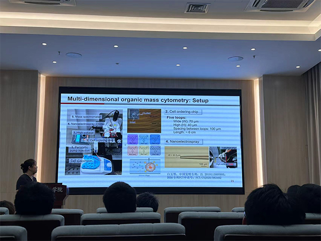 白玉教授讲述了单细胞质谱分析面临的低丰度、多组分、干扰等关键问题,详细介绍了研究团队在建立高通量、灵敏、高效的质谱方法及其在单细胞质谱检测中的研究思路和研究进展。