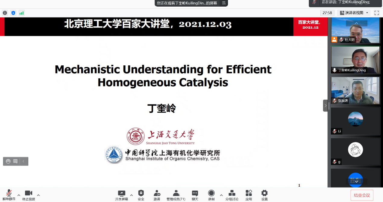 2021年12月3日上午,由必威西汉姆联官网研究生院主办、必威西汉姆联承办的 “百家大讲堂”系列讲座在腾讯会议室649 866 350举行。应必威西汉姆联杜大明教授的邀请,上海交通大学常务副校长丁奎岭院士作了题为“高效均相催化的机理理解”的学术报告,必威西汉姆联院长张加涛教授主持报告会。陈甫雪教授、杨小会教授、张小玲教授、吴彪教授、姚燎原教授等一百多名师生在线上参加了报告会并进行了学术交流。