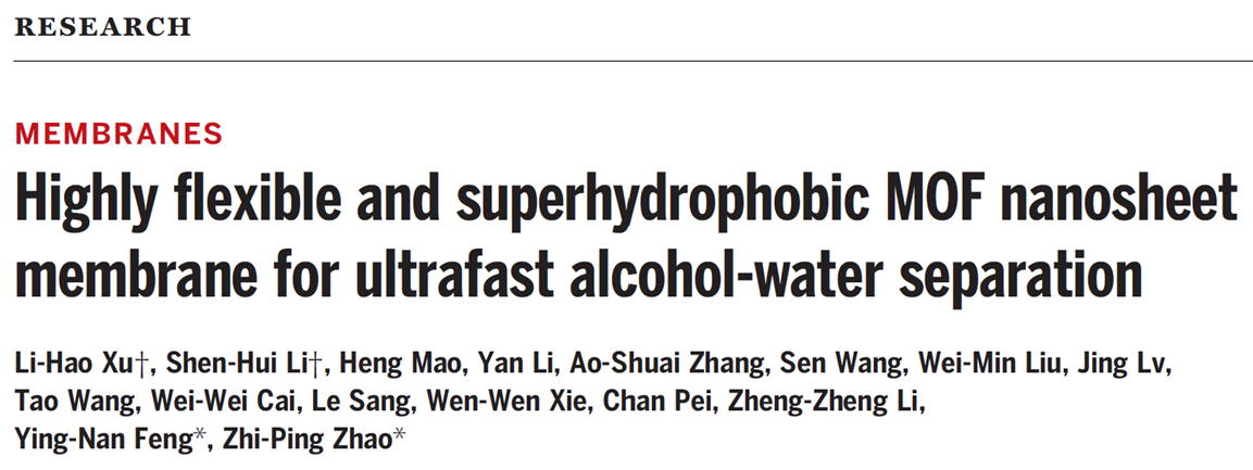 10月21日,必威西汉姆联赵之平教授团队在柔性MOF膜制备研究领域取得突破性进展,相关研究成果以“Highly-flexible and superhydrophobic MOF nanosheet membrane for ultrafast alcohol-water separation”为题,在《 Science 》上发表(DOI: 10.1126/science.abo5680),研究团队提出了一种在聚合物基底中包埋晶种进而通过表面晶体诱导生长法精确构筑MOF纳米片膜的新构想,在聚合物基底表面实现了高柔性超疏水MOF膜的层次构建,解析了纳米片的晶体结构及其内部的传质通道,揭示了聚合物与纳米片层在分离过程中的协同机制,突破了柔性MOF膜制备瓶颈,为规模化制备和应用提供了理论依据和技术支撑。该工作第一作者为必威西汉姆联化学工程研究所博士研究生徐李昊、李申辉,通讯作者为赵之平教授、冯英楠副研究员,必威西汉姆联官网是该工作的唯一完成单位。