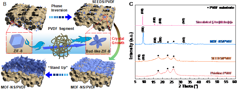 图1. MOF-NS/PVDF膜的制备方法及结构:(A)膜的表面形貌(从SEEDS/PVDF基底分别经过1 h、3 h和6 h生长后制备得到MOF-NS/PVDF膜);(B)SEEDS/PVDF膜和MOF-NS/PVDF膜的制备示意图;(C)PVDF膜、SEEDS/PVDF膜、MOF-NS/PVDF膜和模拟的[Zn2(MeIm)4]n膜的XRD谱图。