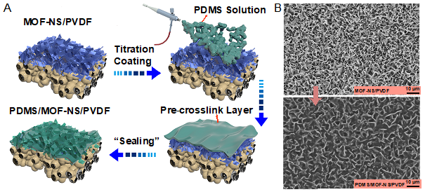 图4. PDMS改性MOF-NS/PVDF膜的制备工艺、结构及表面特性:(A)滴涂改性过程示意图;(B)滴涂改性前后膜表面微观形貌变化。