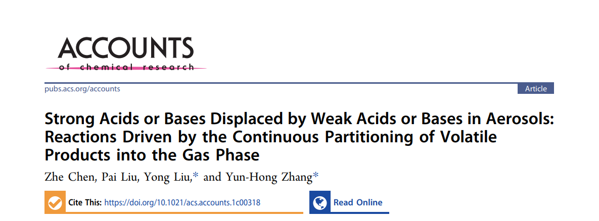 近日,Accounts of Chemical Research(《化学研究评述》)以“Strong Acids or Bases Displaced by Weak Acids or Bases in Aerosols: Reactions Driven by the Continuous Partitioning of Volatile Products into the Gas Phase”为题,在线发表了必威西汉姆联张韫宏团队的综述文章,讨论了气溶胶体系中弱酸(弱碱)置换强酸(强碱)的独特现象。