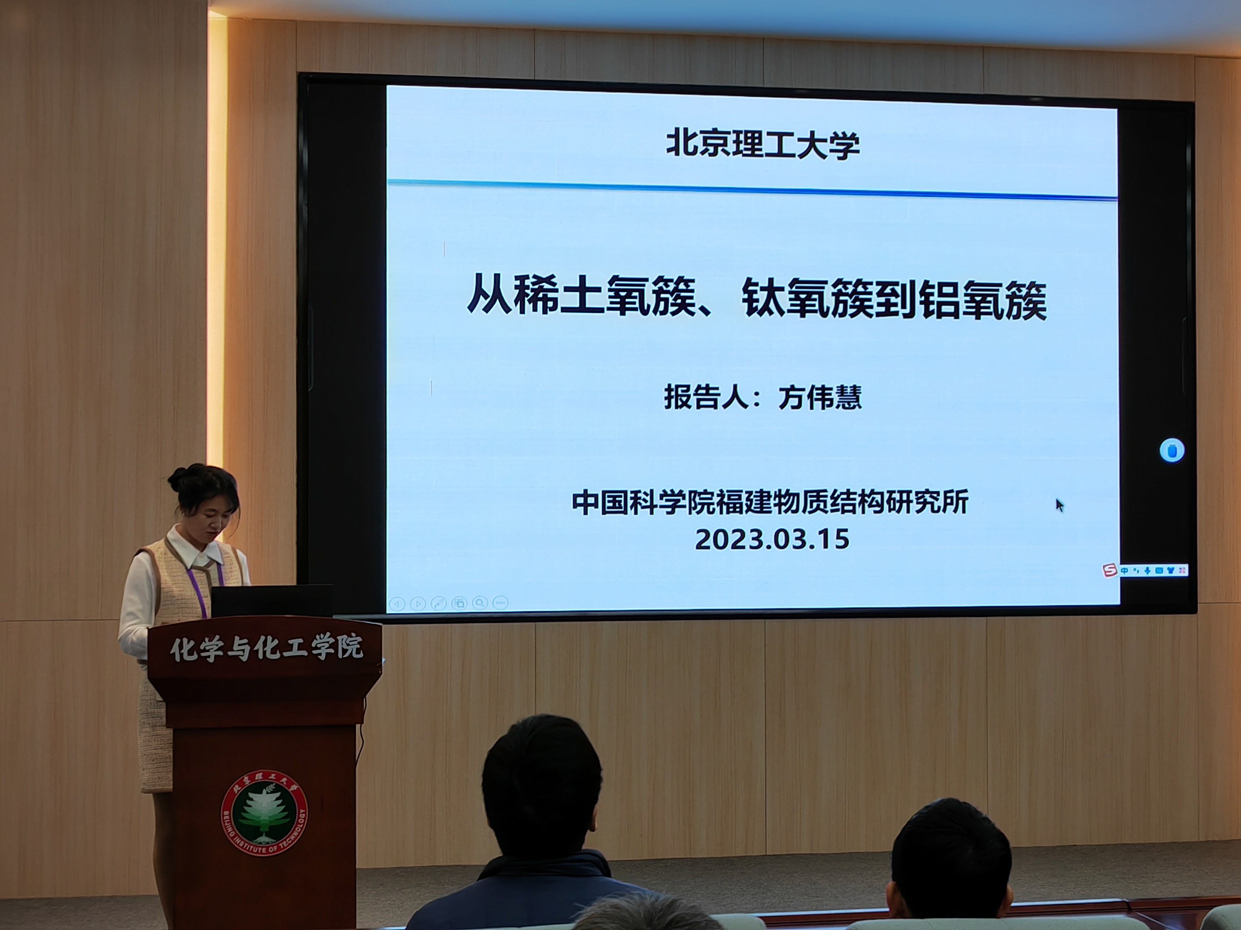 应必威西汉姆联邀请,中科院物构所方伟慧研究员于2023年3月15日14:00做客北理工“21世纪学科前沿”系列论坛,为我院广大师生带来题为“从稀土氧簇、钛氧簇到铝氧簇”的精彩学术报告。本次报告在生态楼118报告厅进行,由杨国昱老师主持,近六十名化院师生参加了报告。